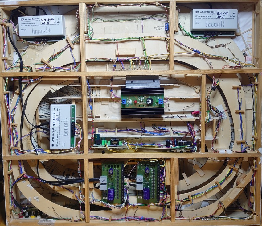 Auf der Unterseite der Anlage befinden sich alle zum Betrieb notwendigen Platinen. Die Kabelverbindung zwischen Pult und Anlage bestand aus 92 Adern. In der Mitte ist die Diodenmatrix zur Ansteuerung der Weichen,  Signale und Fahrstrassen. Oben rechts sind die elektronischen  Fahrtenregler. Unten in der Mitte ist die Gleisbesetztanzeige für die abschaltbaren Gleise (bis März 2008). Warum diese Anlage liebevoll "Platinenhalter" genannt wurde, kann ich nicht erklären. Da ist doch noch Platz.